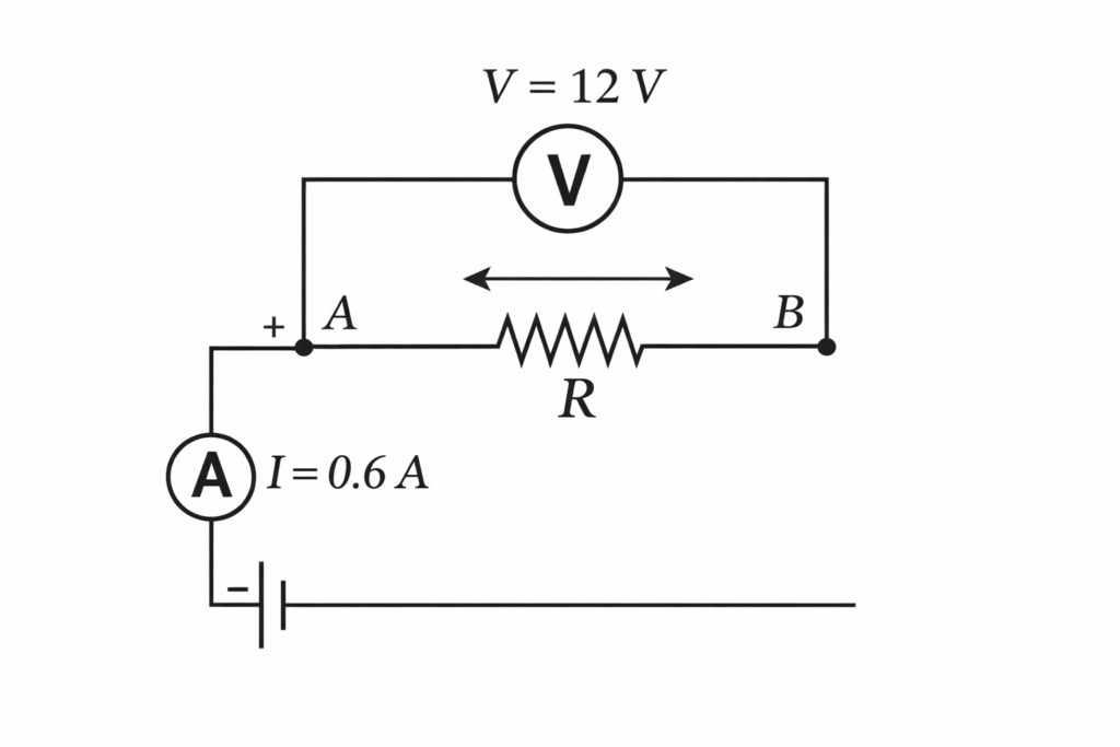1. If 0.6A current flows through a resistor shown in figure. Voltage of two points of resistor is 12V. What is the resistance of the resistor?
